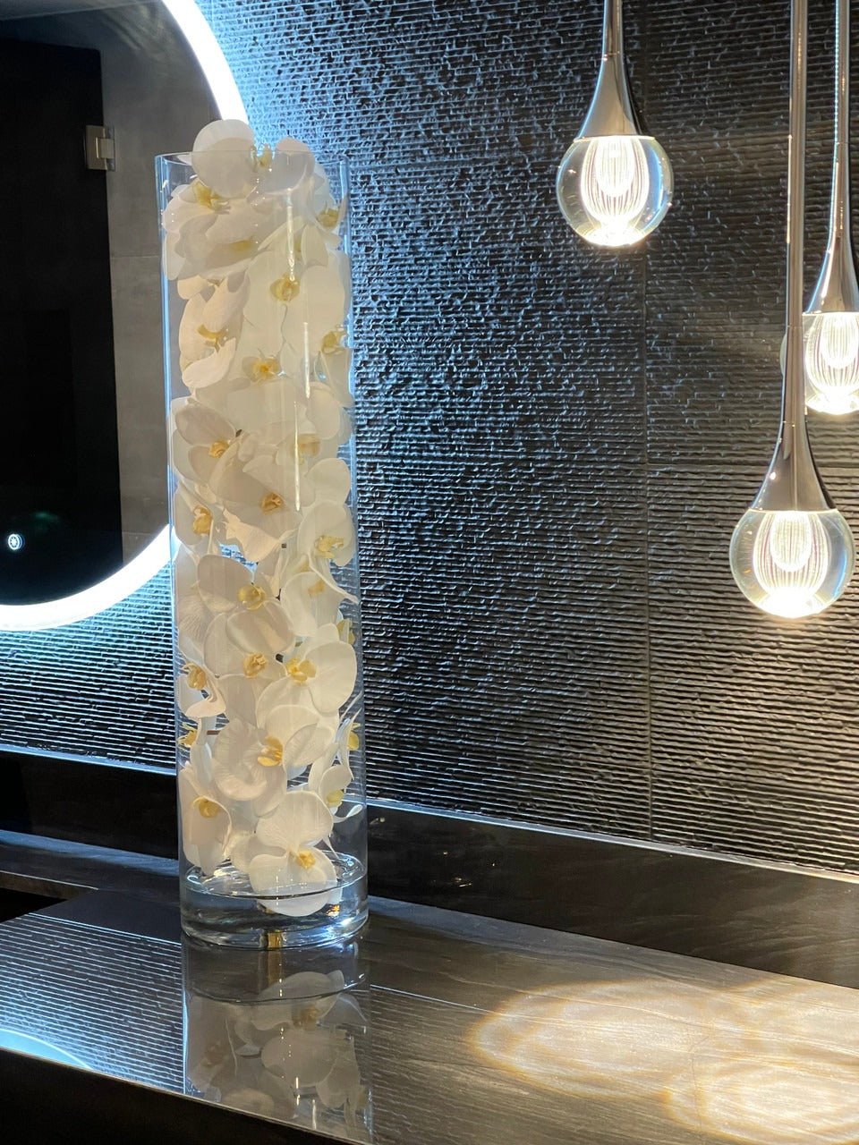 White phalaenopsis orchids anchored in Illusion water- completely contained inside a glass cylinder for a modern and sophisticated look. Grouped in three different sizes (40. 32. and 28). paired or elegantly standing alone. the simplicity of this vase makes it perfect for any space and decor style.These white phalaenopsis orchids in cylinder vase are also great for any event. These vases are very versatile and can be used for any occasion. whether you are in need for an attractive centerpiece or a stunning and sophisticated home glass decor.Hand-blown crystal clear glass not machine made. Crafted with thick glass and a stable bottom for the perfect table centerpiece.